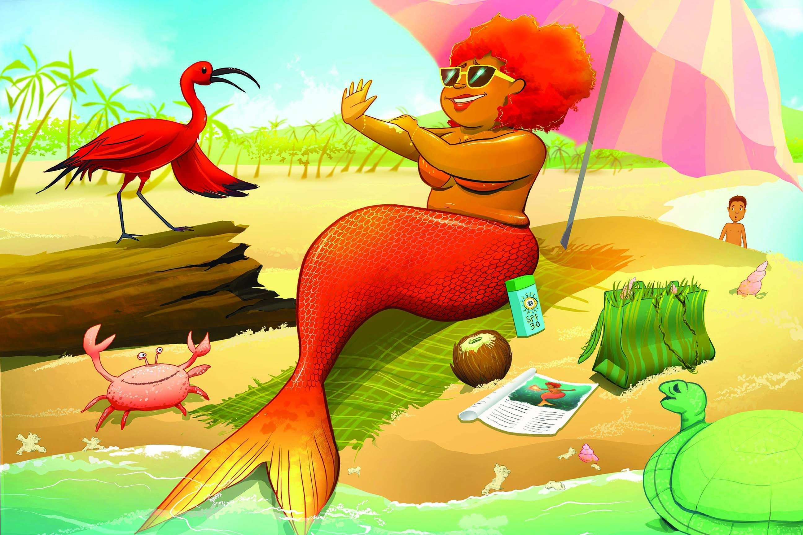 The figures that populate Janine Carrington’s illustrations, mermaids, children, neighbours in traditional garb are all part of her world where imagination and culture intertwine. The artwork is not just visual; it’s an invitation to explore the boundless possibilities of identity, community, and self-expression as it pertains to future generations.